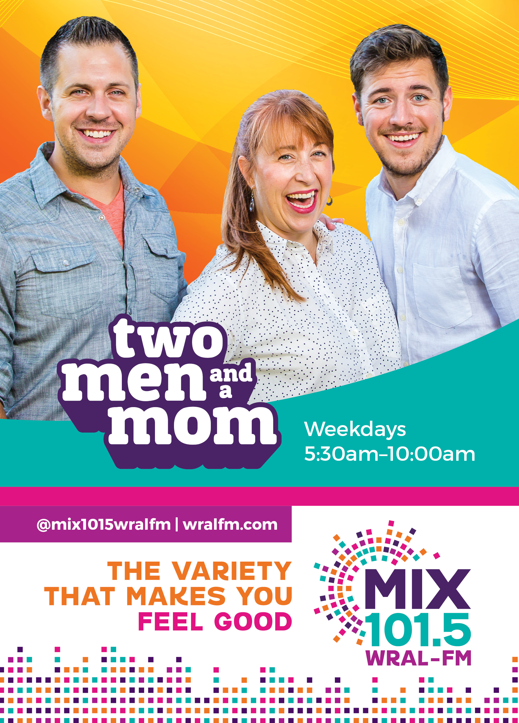 Print ad for Mix 101.5's morning show, Two Men and a Mom.
