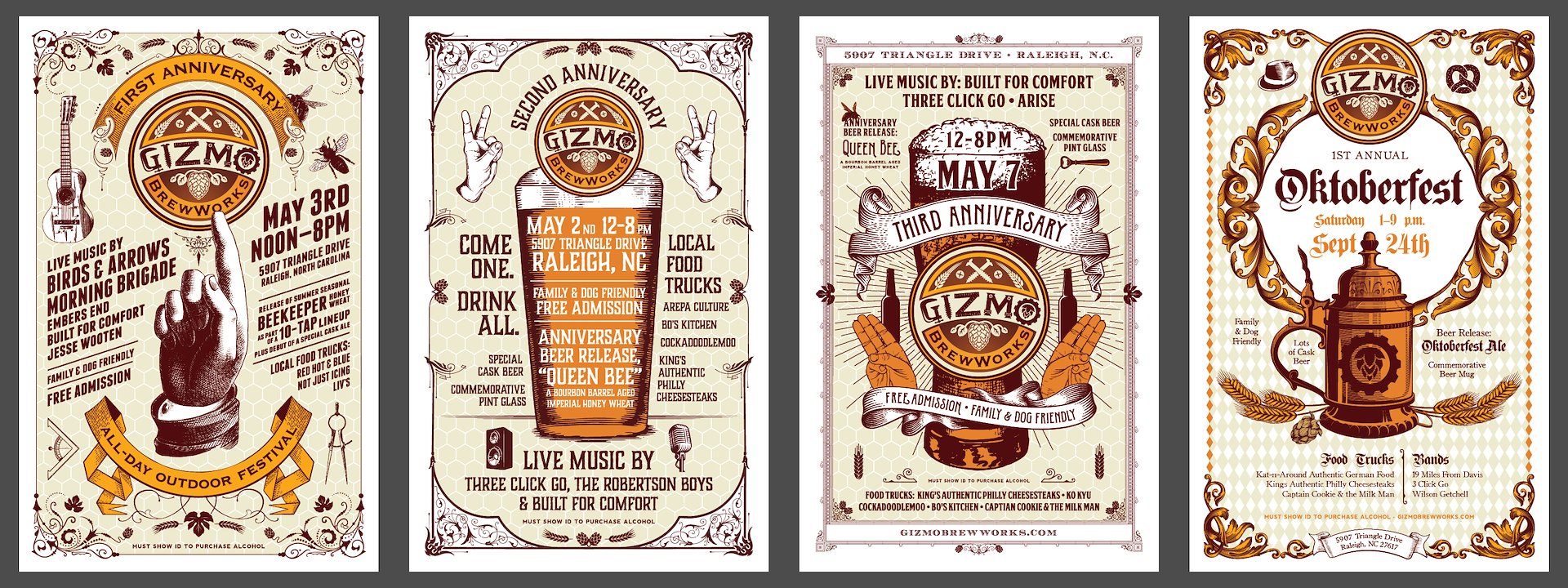 It’s almost time to design the poster for the Gizmo Brew Works 4th Anniversary celebration coming up in May 2017, so I thought I would display the 2014-2016 series. The are the posters for the past three anniversaries, as well as the 1st Annual Oktoberfest from last year. Cheers!