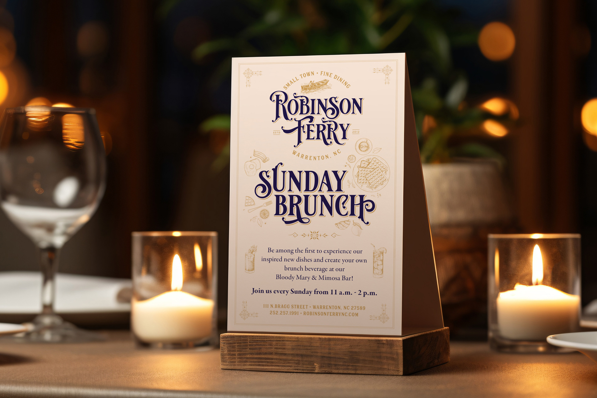 I developed the full branding system for Robinson Ferry, a restaurant in Warrenton, North Carolina. The project included logo design, visual identity, menus, print and digital collateral, posters, apparel, table tents, signage, and social media graphics. The goal was to create a warm, welcoming identity that reflects the restaurant’s regional character and elevated casual dining experience. The resulting system is cohesive, flexible, and designed to work across every touchpoint—from menus and marketing materials to merchandise and in-restaurant displays.